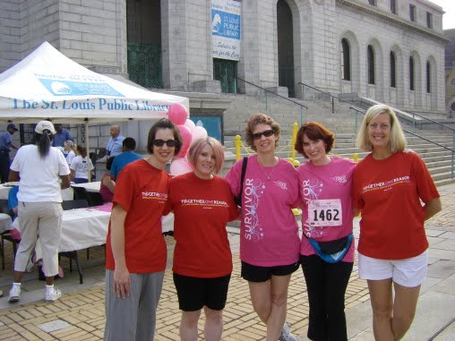 Shelly and I did skip the “Survivors’ Walk,” which they do early on before the Race starts, because she warned me it was very, very emotional. I decided that I’d done enough bawling after my diagnosis, and I prefered to avoid further tears. So we ran around to some of the freebie booths (Ed thinks it’s funny that women who survive breast cancer aren’t afraid to trample each other to collect bags of free loot). Then we took our Race team pictures, and I hung out with some of the St. Louis Public Library team members (love those library ladies!). Music blared and people hugged, and a sense of affirmation bubbled up inside me so that I had tears in my eyes anyway!